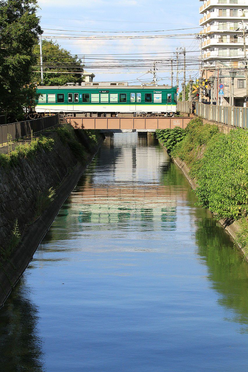 三井寺駅近くの琵琶湖疎水の鉄橋を渡る列車です。