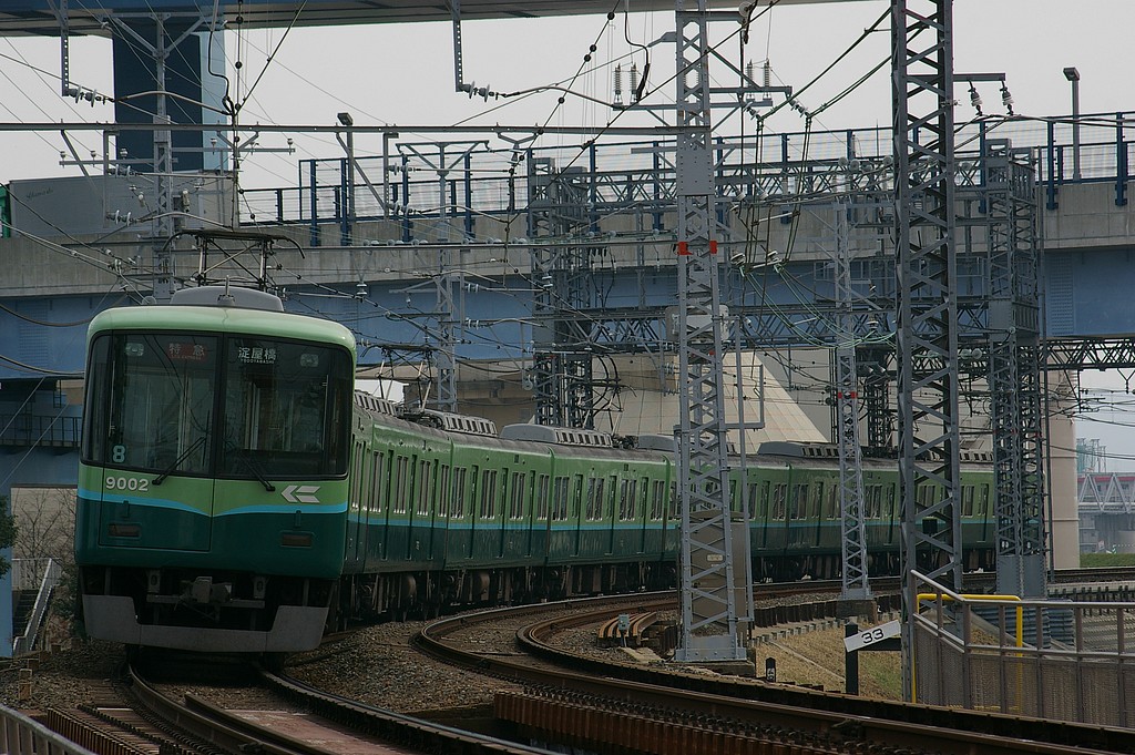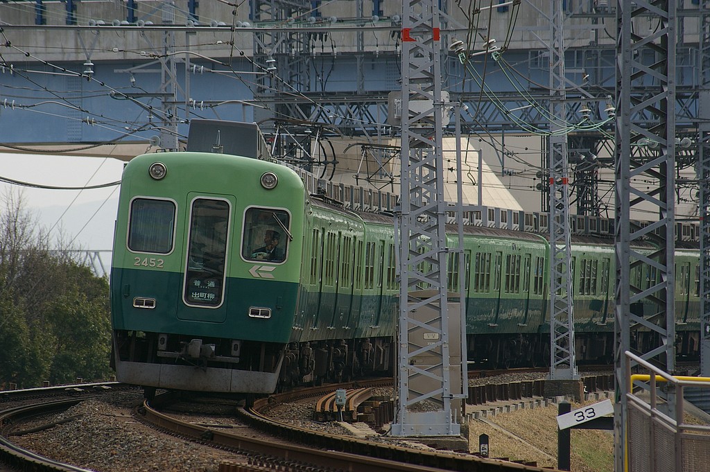 淀-八幡市間の橋梁とカーブが連続する区間です。