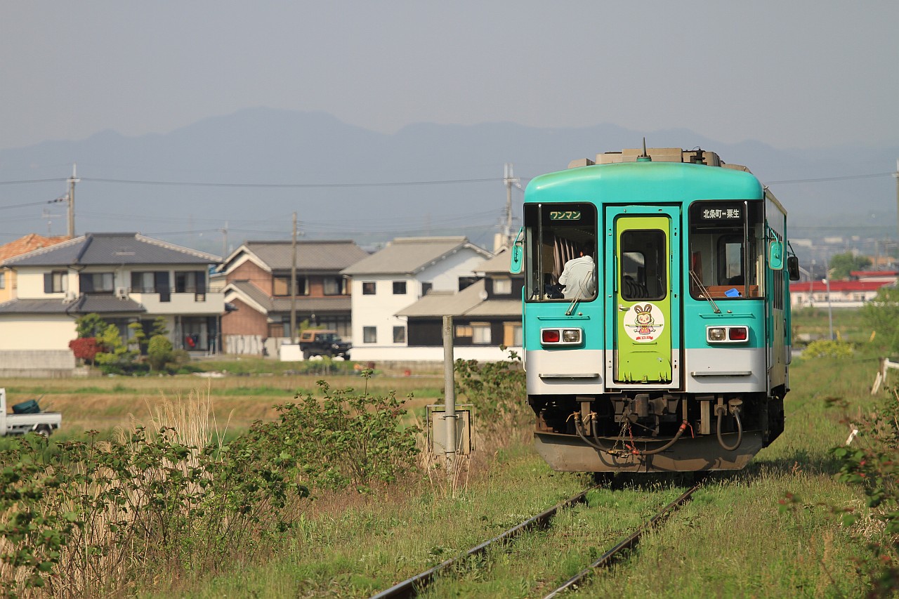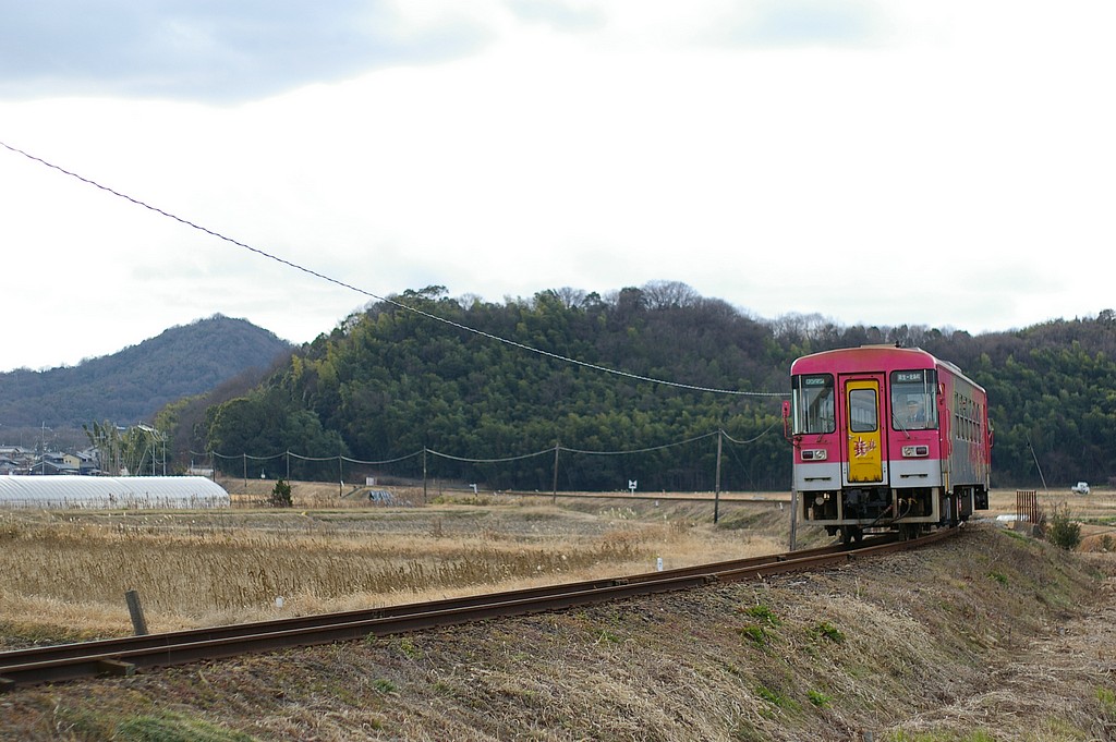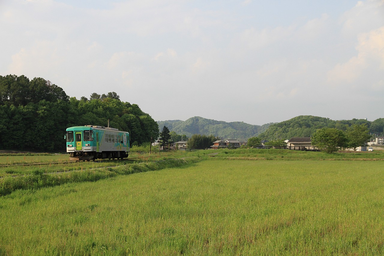 粟生駅の手前で大きくカーブしている区間です。 カーブの途中に踏切があり、そこから狙うことができます。 せっかくのきれいなカーブ区間ですが、列車は単行なので、 どこでシャッターを切るかが微妙です。 列車本数:1時間に1往復です。起点の粟生駅近くなので、運が悪いと1時間近く待たされます。 駐車スペース:踏切の近くの道路脇に駐車可能です。