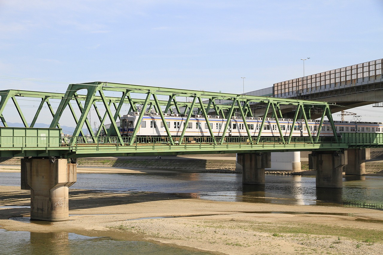 大和川の鉄橋を渡る列車です。