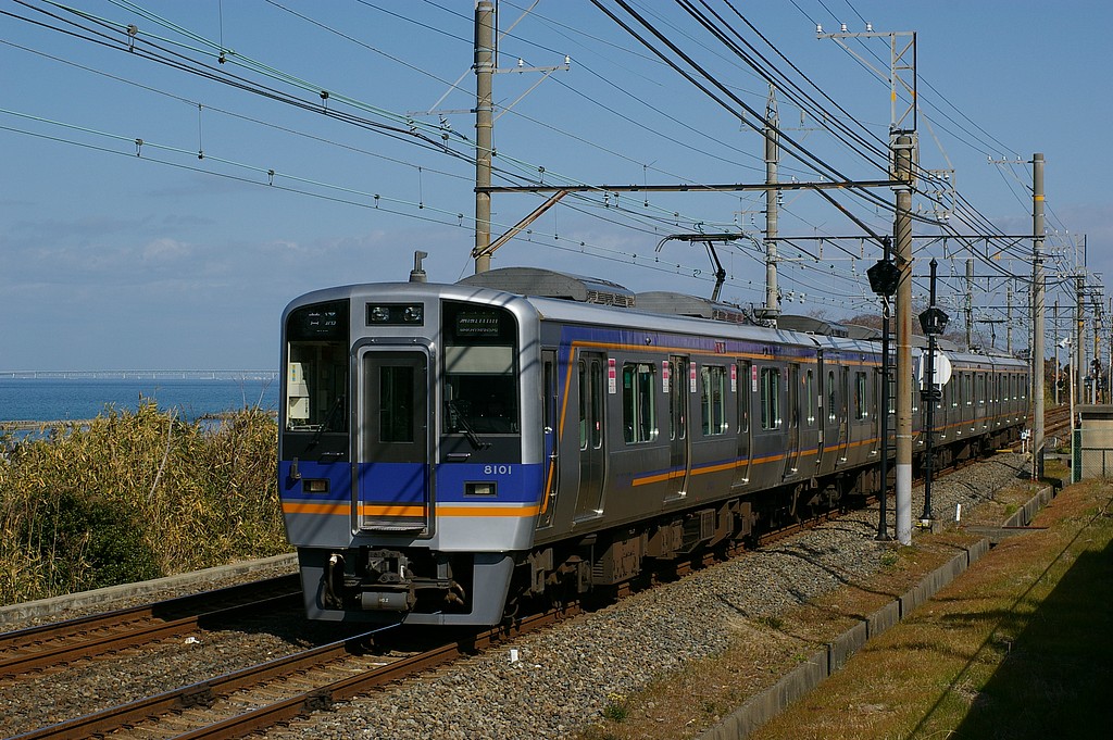 2010.02.07 8000系 PENTAX *ist DL2 + smc PENTAX FA 50mm F1.4 ISO 200、1/1000、F7.1、35mm換算75mm 海沿いを走る列車です。 国道26号線から、住宅地の中に入っていったところです。 線路の向こう側は公園で、その先に海が広がっています。 海の先には関空の連絡橋も見えています。 列車は頻繁にやって来ますので撮影しやすいです。 駐車スペース:線路沿いの道路は道幅も広いので駐車可能です。