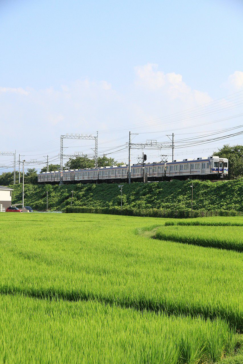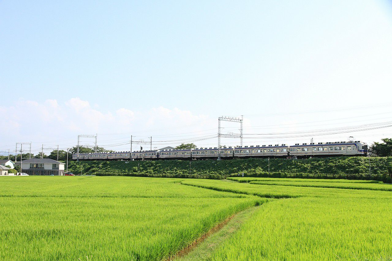 築堤を行く列車を手前の水田と一緒に狙うことができます。