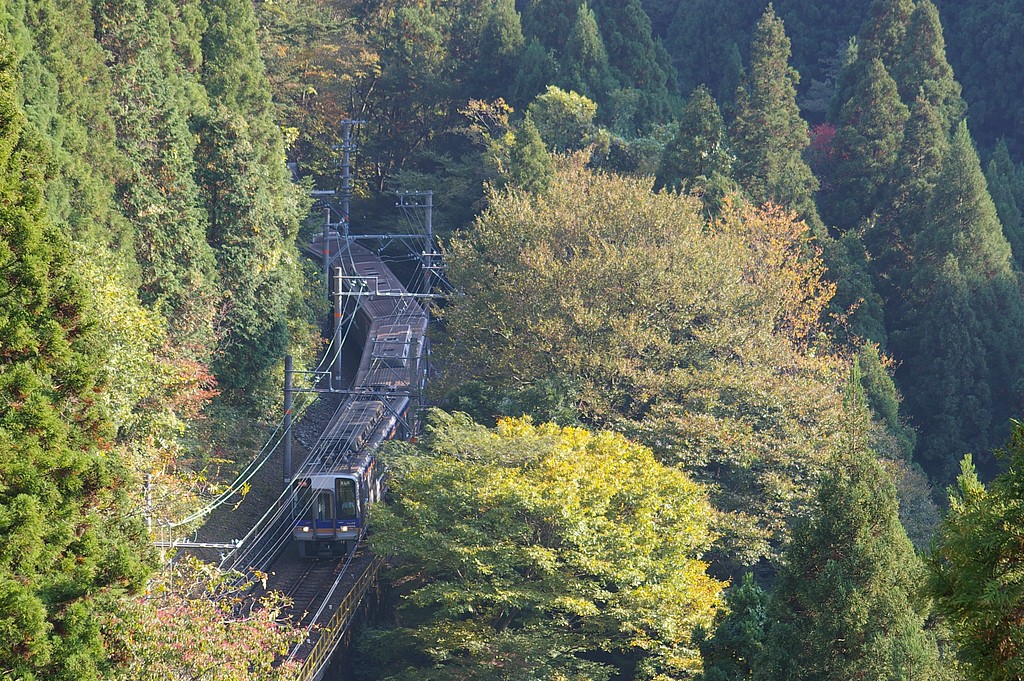 山の中を走る高野線を少し高い所から狙います。