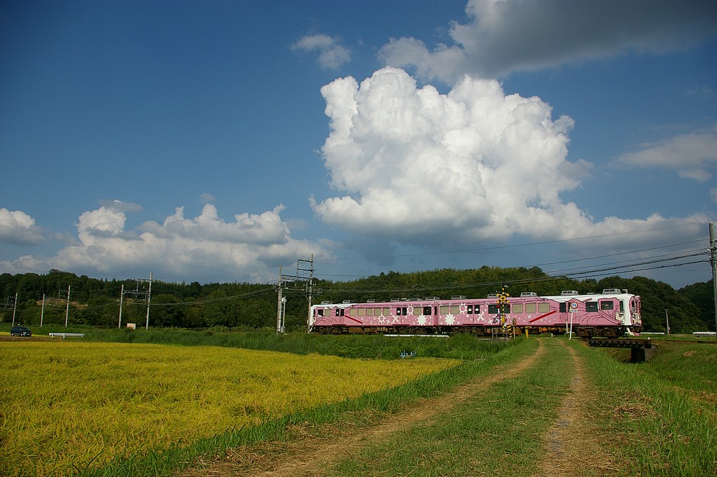 2009.09.25 860系 PENTAX *ist DL2 + smc PENTAX DA 18-55mm F3.5-5.6 AL ISO 200、1/500、F10、35mm換算27mm 田園風景の中を走る伊賀線の列車です。 比土駅から北へ少し行ったところにある、農道の踏切付近です。 列車本数は、上下ともに1時間に2本程度走っていますが、昼間は2編成で行ったり来たりしているだけのようです。 駐車スペース:周辺の道路は狭いですが、邪魔にならないところを探せば駐車可能です。