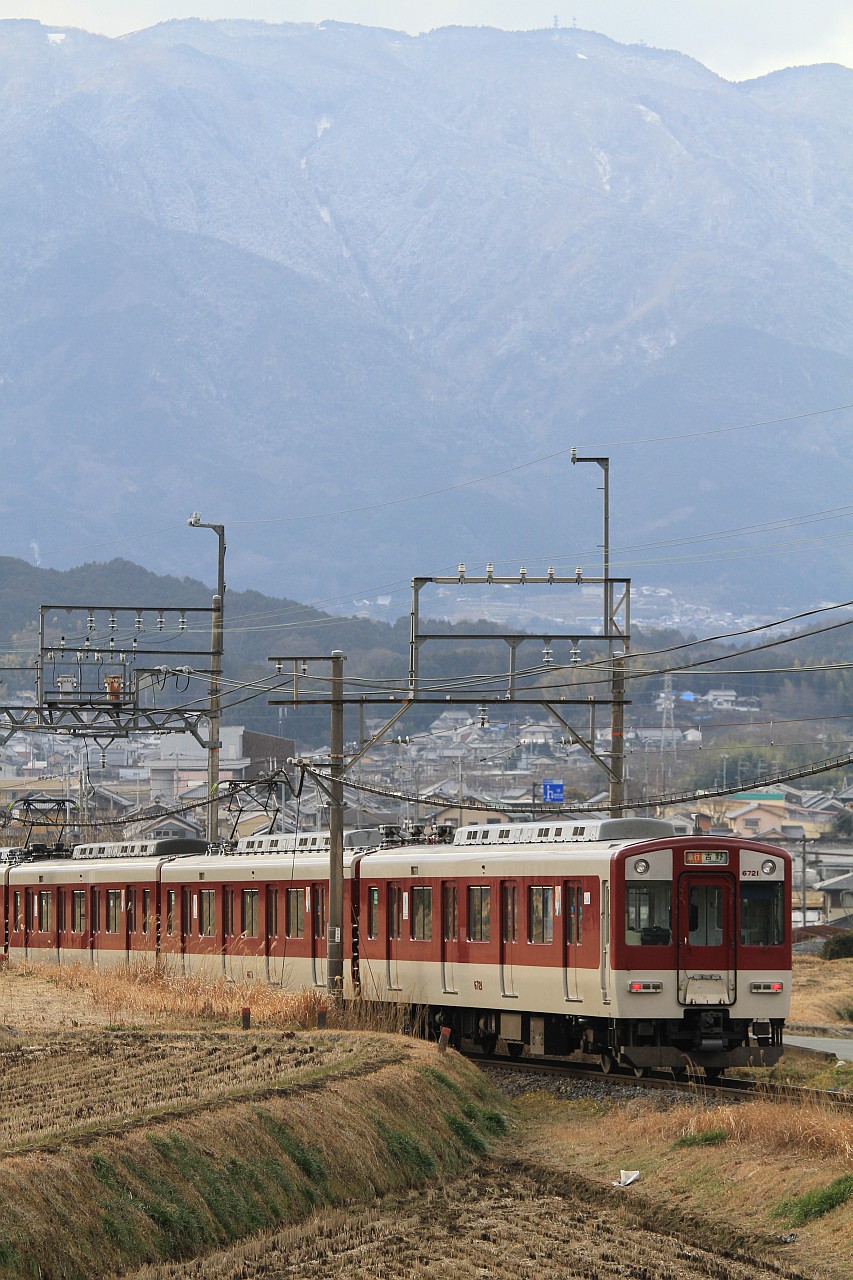 望遠レンズで圧縮すると、バックの葛城山の麓を行くような構図で切り取ることができます。