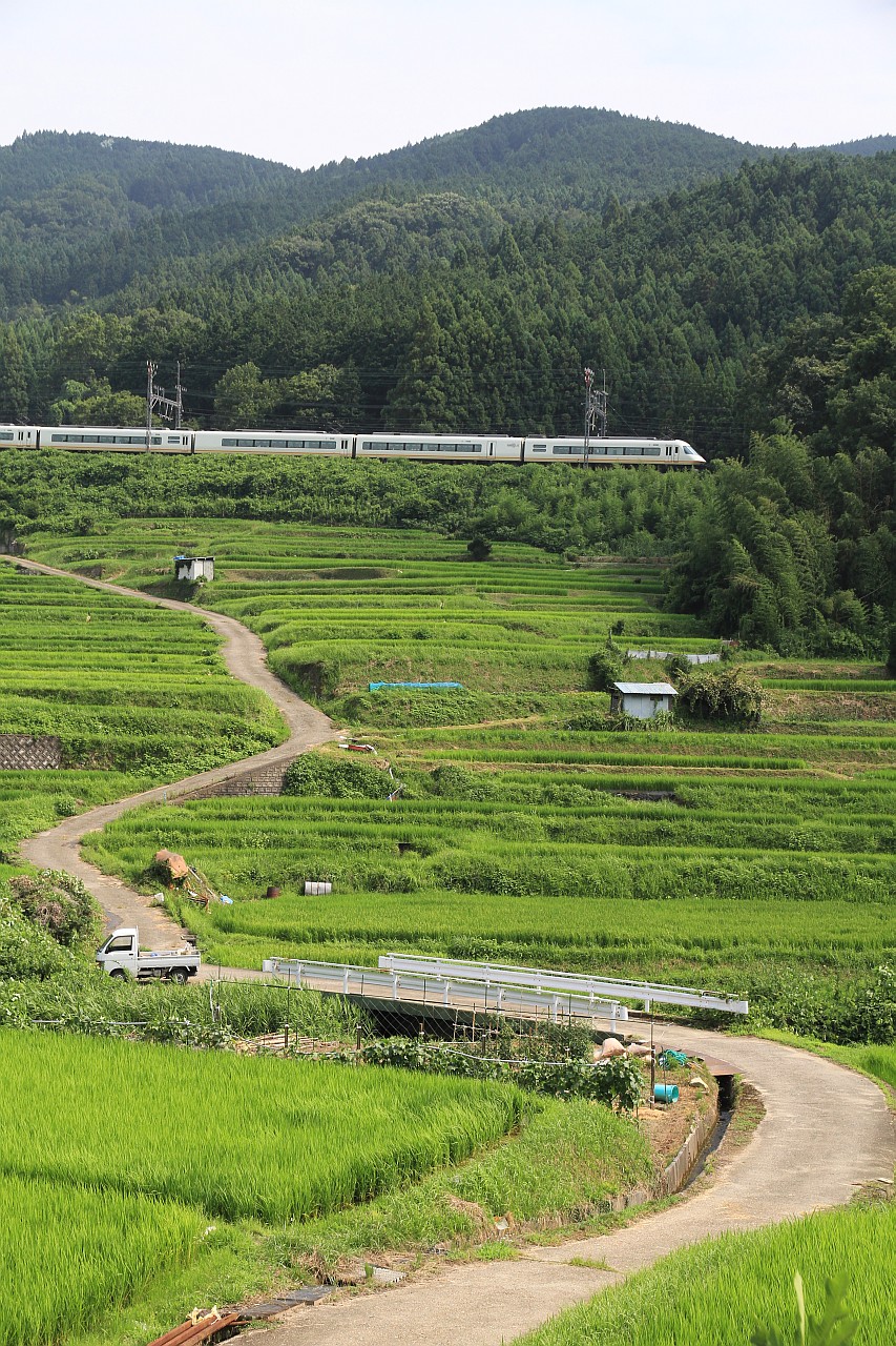少し位置を変えると、斜面に沿って蛇行する農道と