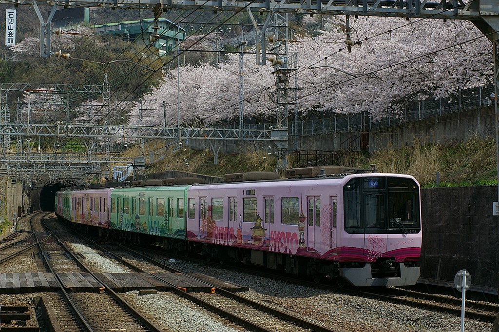 2008.04.05 3220系 PENTAX *ist DL2 + smc PENTAX FA 50mm F1.4 ISO 200、1/500、F7.1、35mm換算75mm 石切駅ホームの奈良寄りの場所です。 線路の少し上に桜の木があり、桜の花と列車を合わせて撮影することができます。 列車本数:頻繁にやって来ます。種類も普通車、特急車、阪神車と様々狙えます。