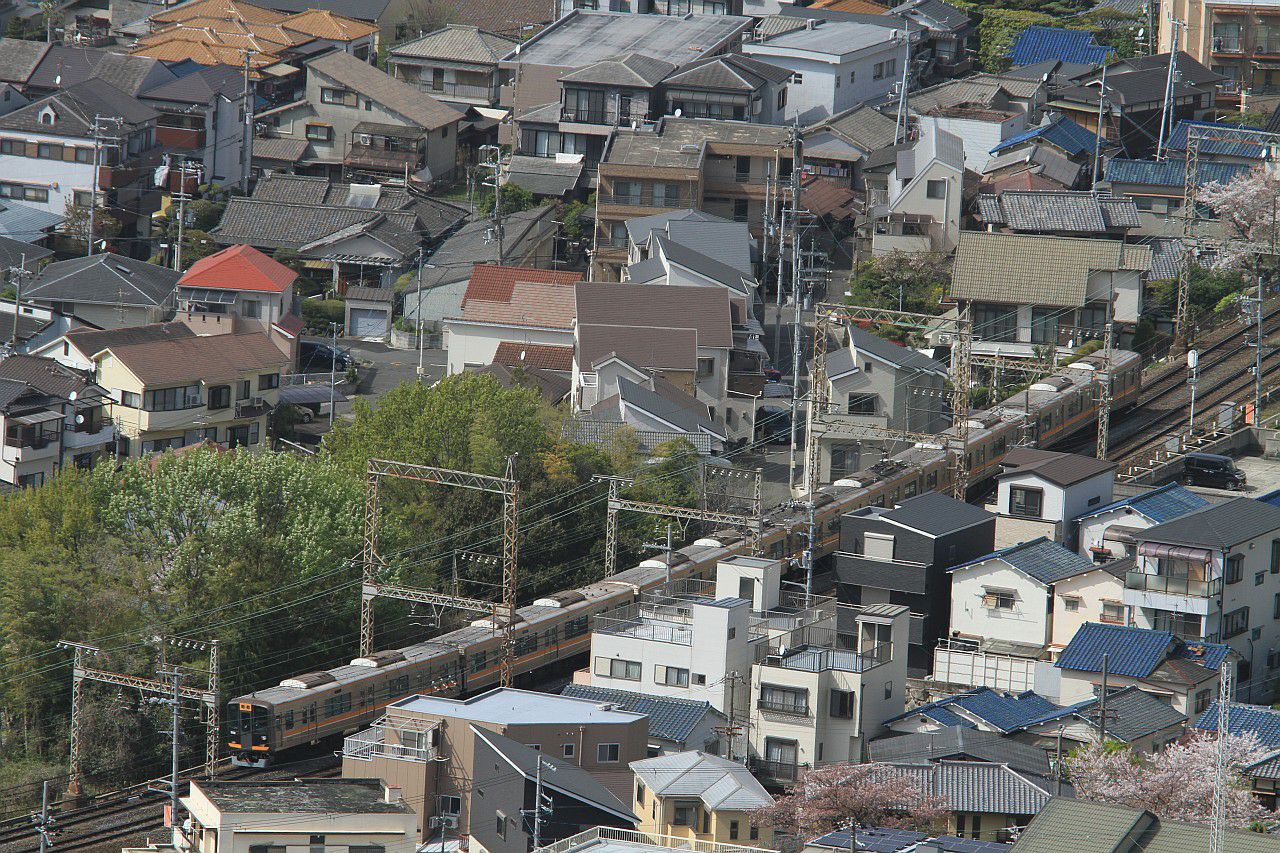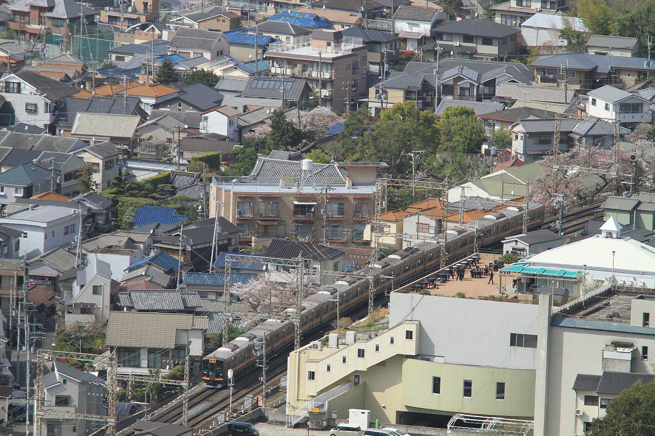 額田-石切間を行く列車を俯瞰で狙うことができます。