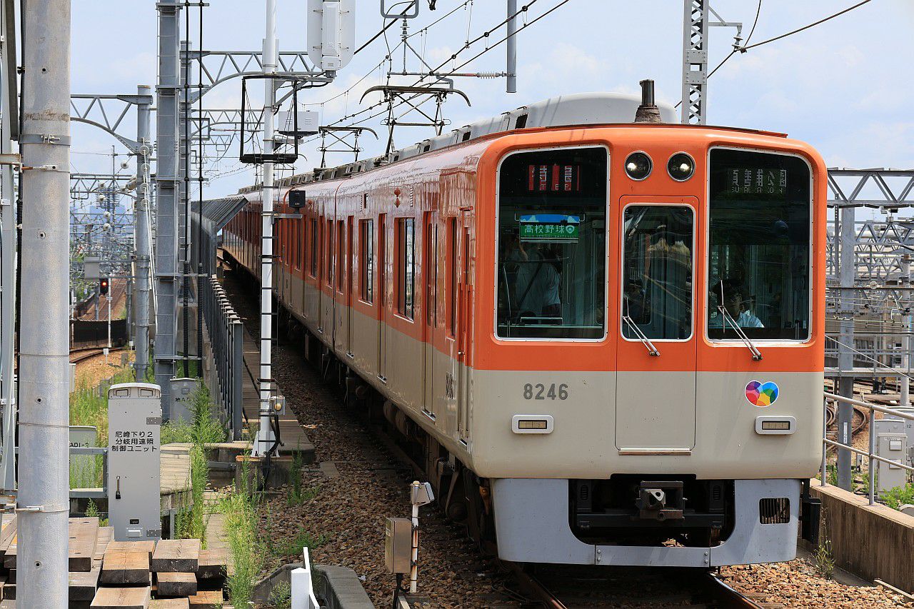 阪神本線の列車がなんば線を越えて下りて来るところを狙えます。