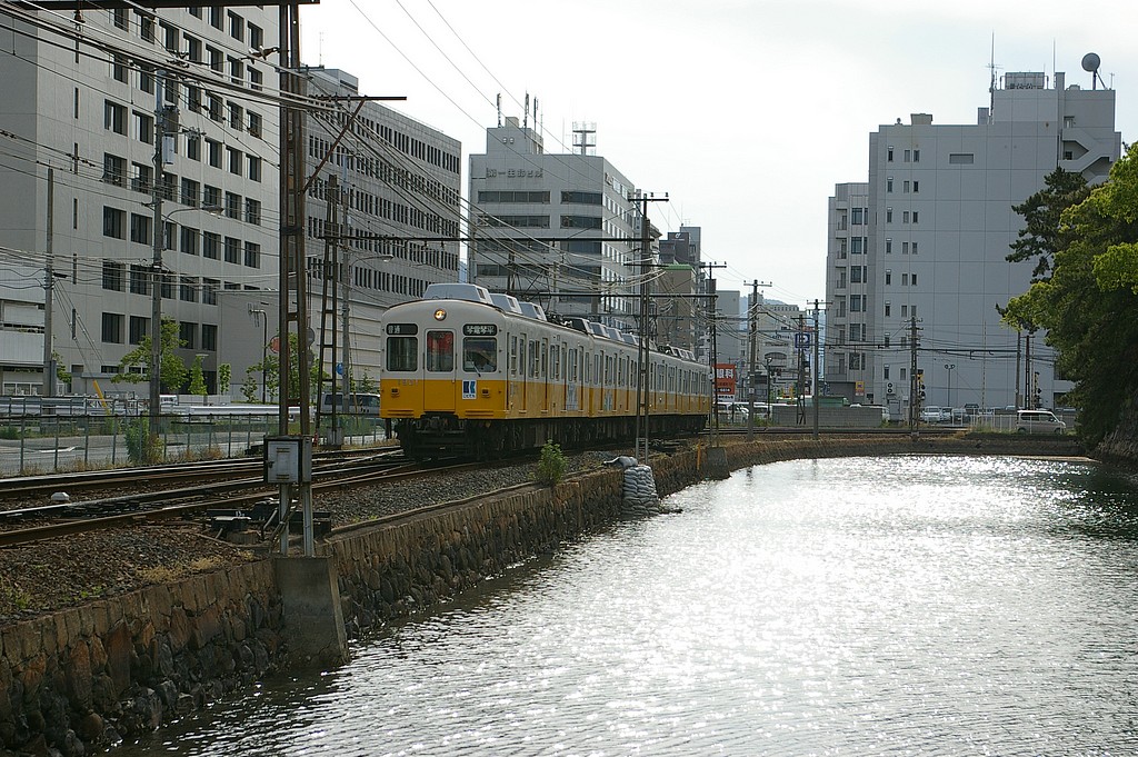 2009.05.15 1200形 PENTAX *ist DL2 + smc PENTAX DA 18-55mm F3.5-5.6 AL ISO 200、1/500、F8.0、35mm換算82mm お堀とビルに囲まれたところを列車が走っていきます。 線路脇にある高松城の公園から撮影できます。 琴平線と長尾線の両方の列車が頻繁にやって来ます。 駐車スペース:観光用駐車場か、コインパーキングぐらいはあると思います。