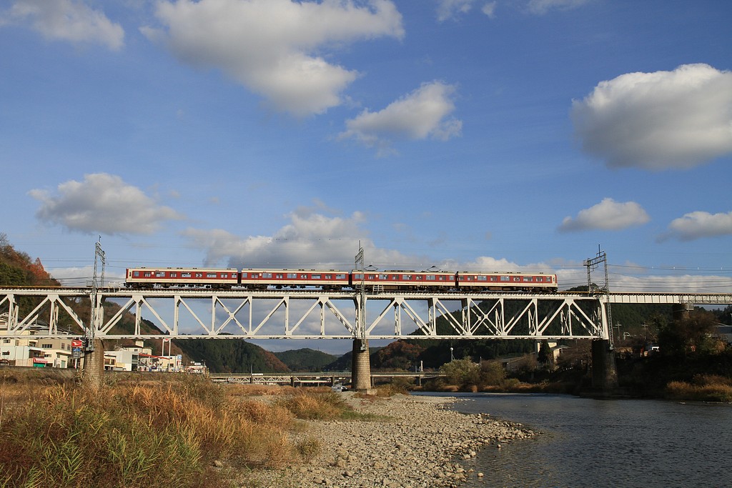 二ノ瀬駅近くで、線路が川と道路を越えるところがあり、